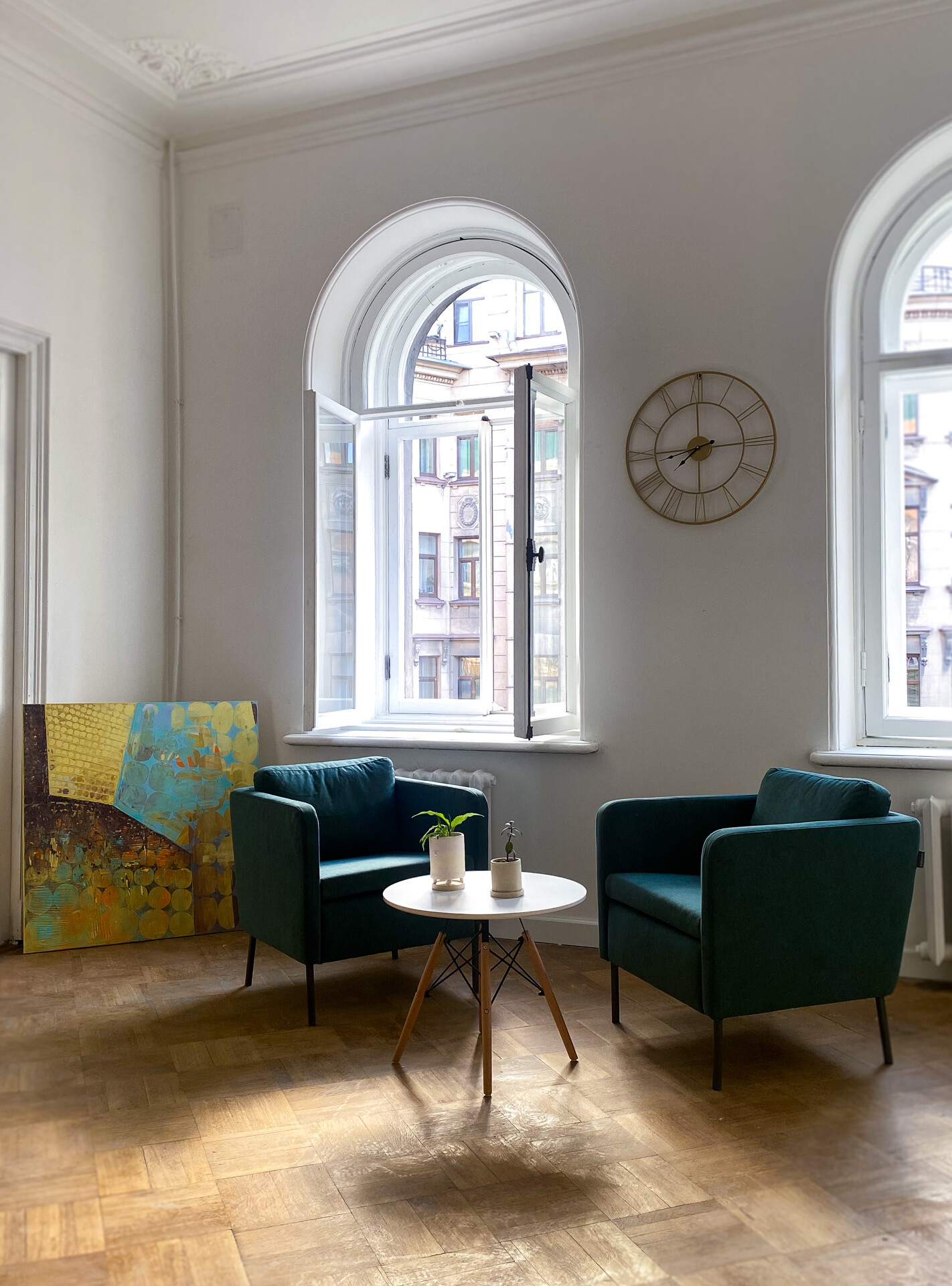 Большое и уютное пространство: кафе для гостей, гостиная для отдыха, 3 мастерских