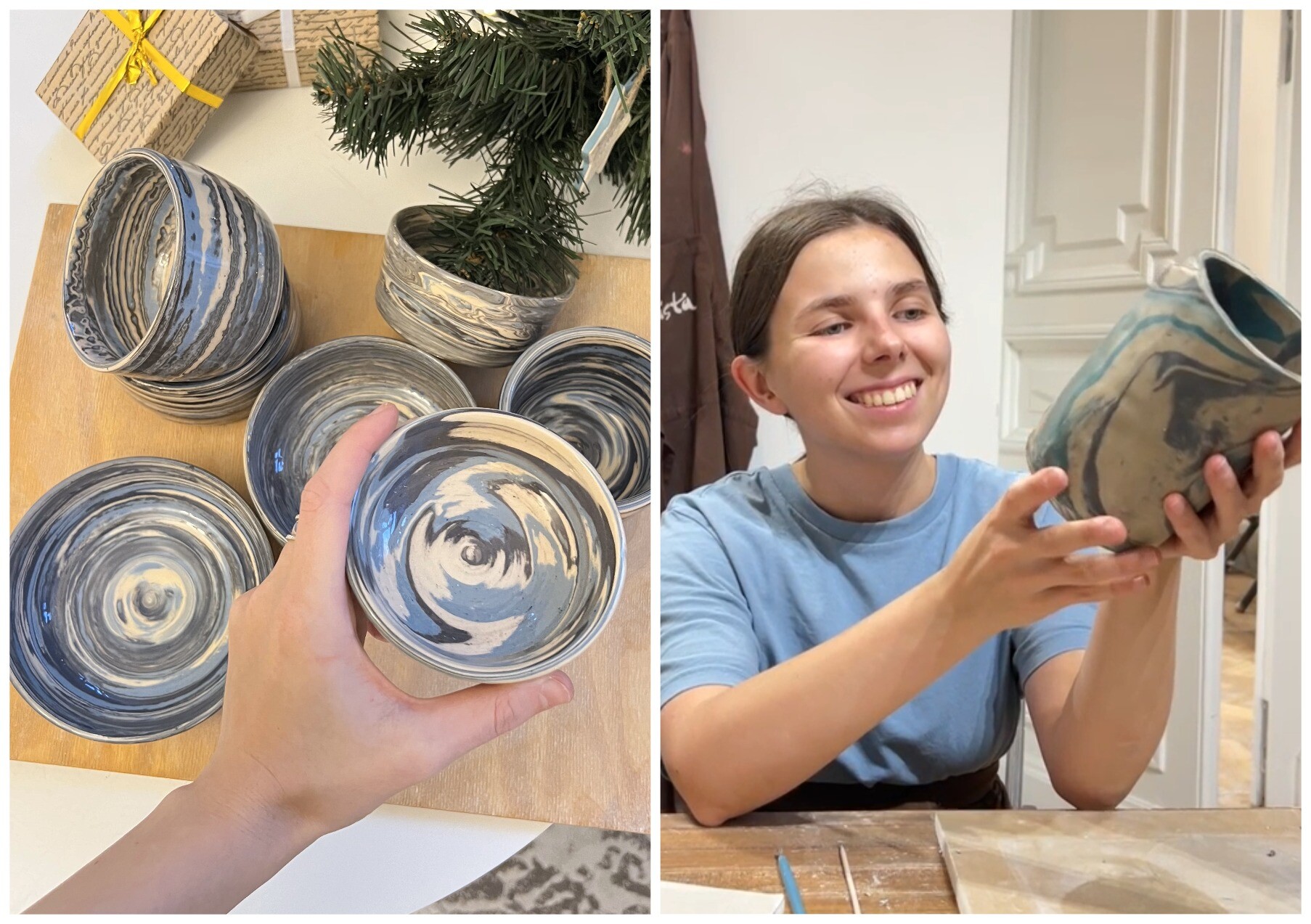 В каждый МК по умолчанию входит: ручная лепка, гончарный круг, роспись ангобами* (жидкой глиной) + покрытие прозрачной или цветной однотонной глазурью.