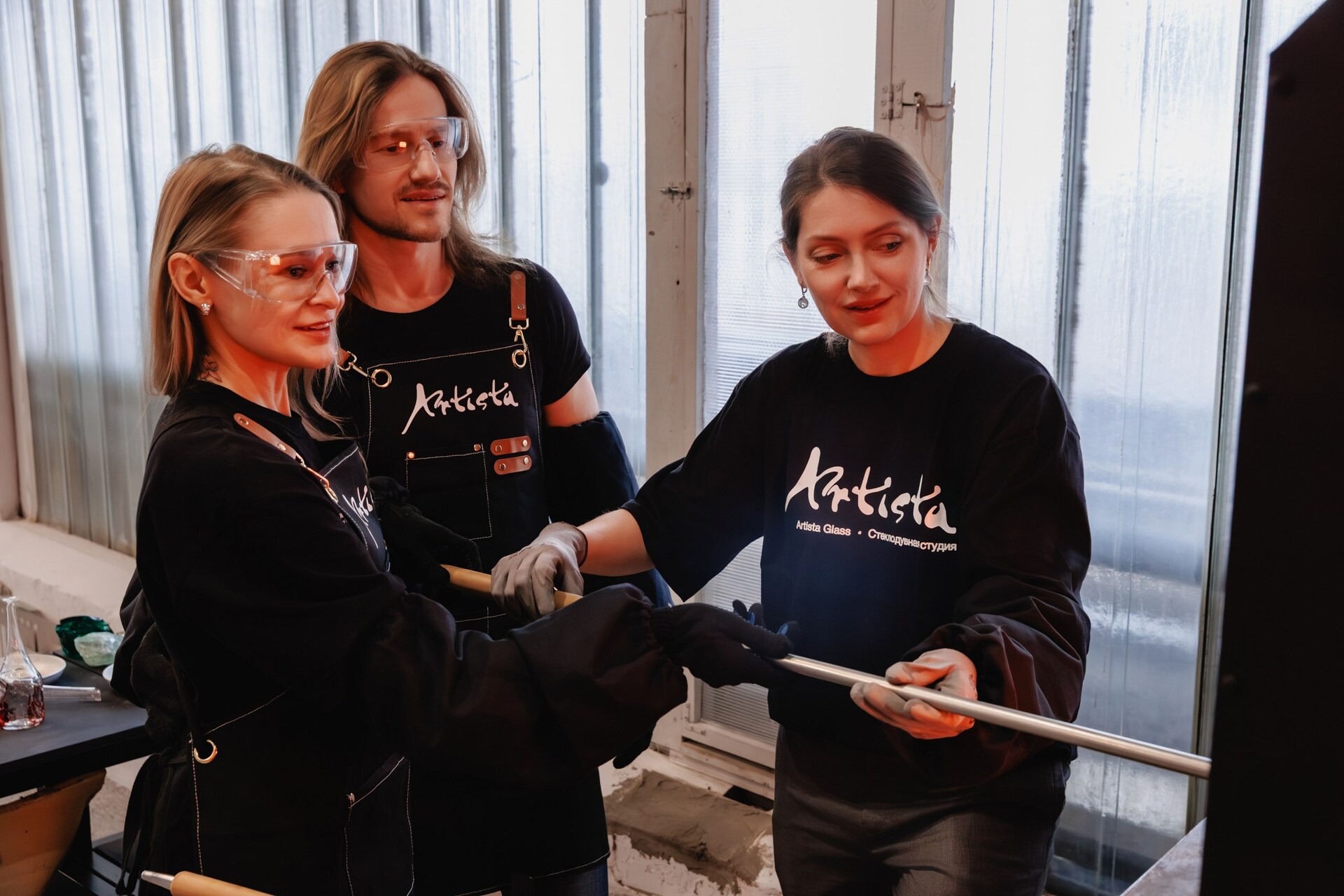 Каждый участник по очереди выдувает изделие вместе с мастером. Трубка стерелизуется после каждого участника.