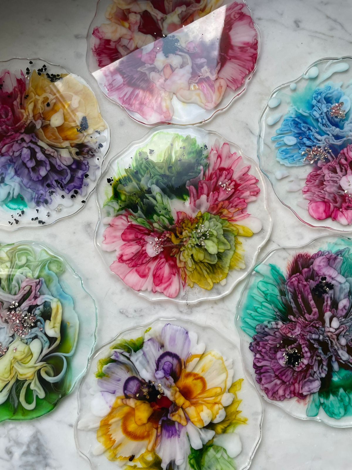 На мастер-классе вы научитесь работать в смешанной технике: эпоксидная смола и спиртовые чернила. У вас получится два ярких подстаканника с абстрактным узором, имитирующим бутон цветка