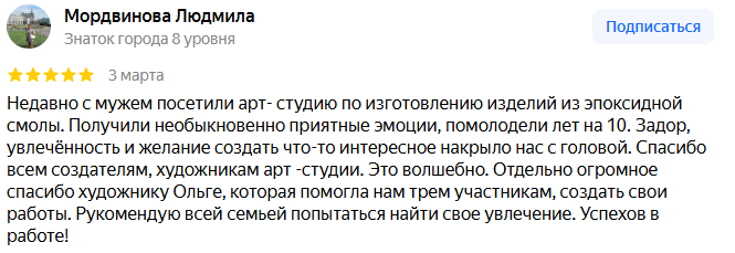 7 лет назад закончила курсы "Современный художник", где углубленно изучала такие художественные направления как интерьерные картины, предметы декора из эпоксидной смолы, работа с текстурной пастой и флюид-арт (картины, созданные при помощи жидкого акрила).
