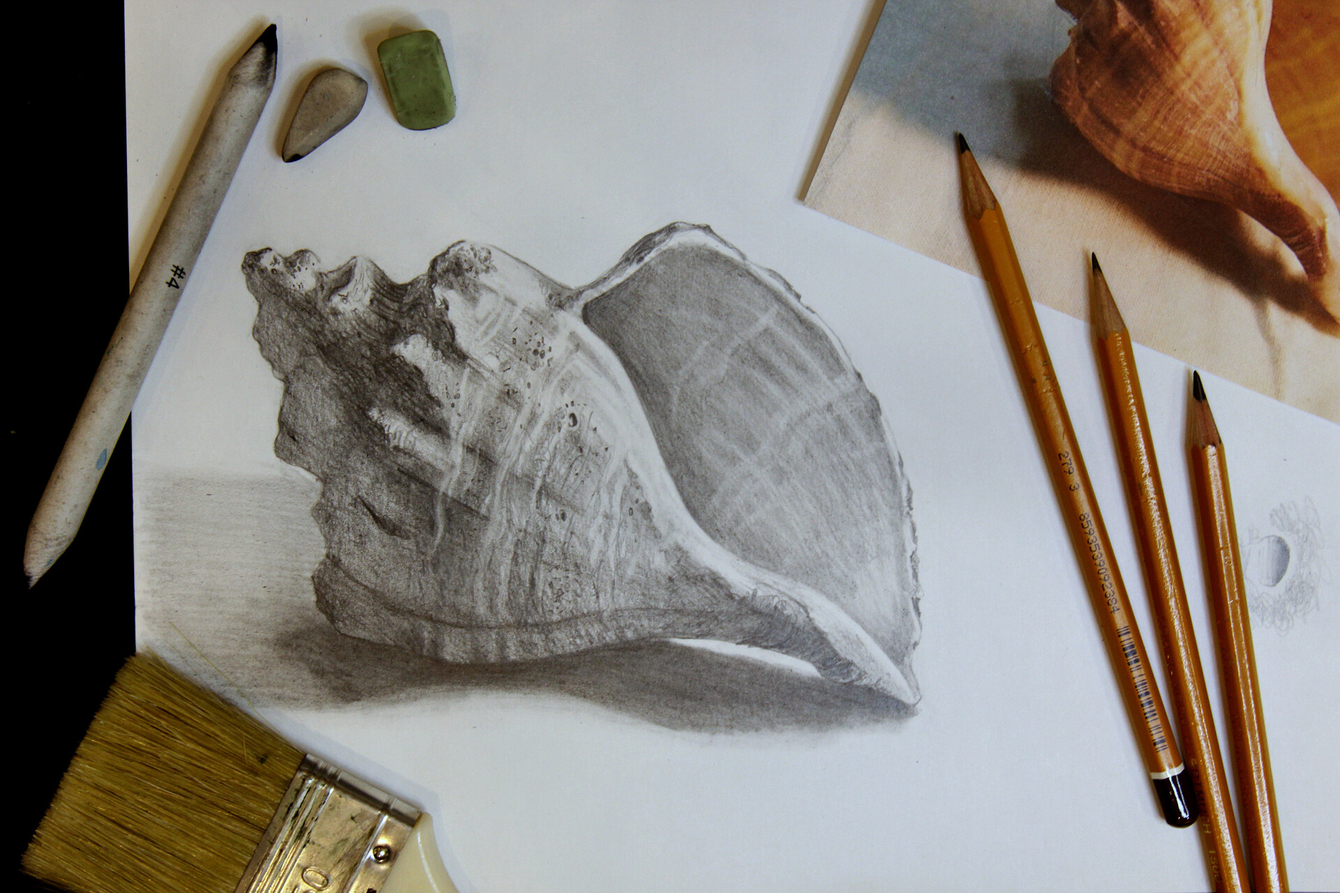 На примере ракушки научимся передавать материальность предметов, сделаем подробный свето-теневой рисунок.