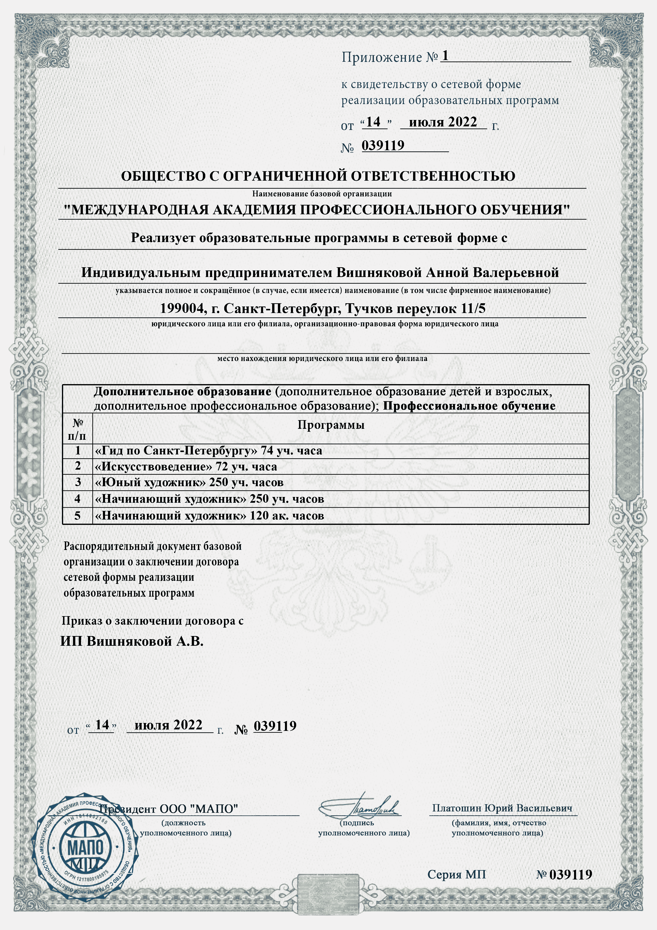 Студия Artista засвидетельствовала свое право оказывать услуги по реализации образовательных программ в сетевой форме совместно с ООО "МАПО" на основании партнёрства.