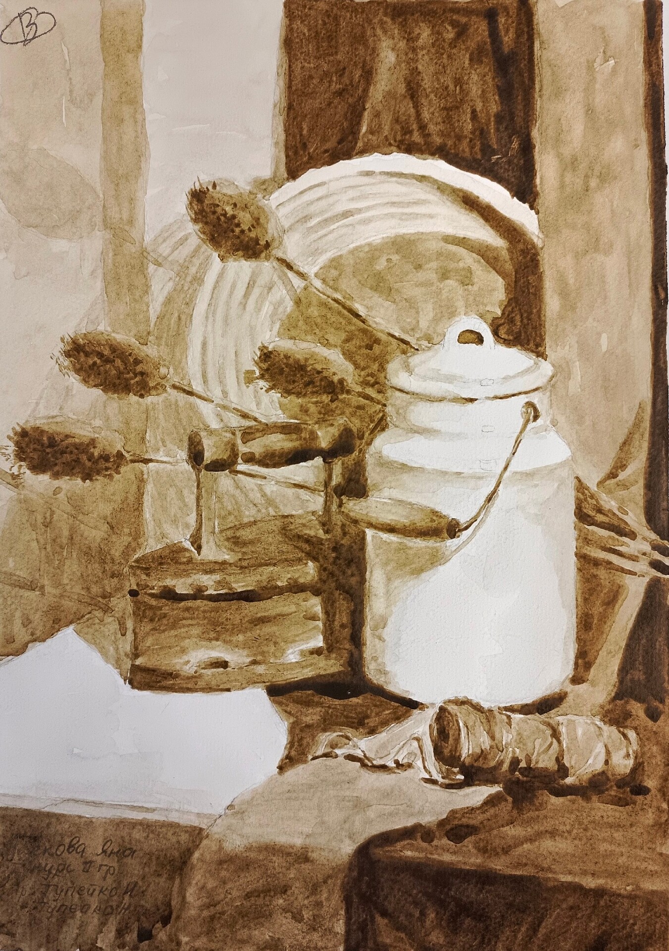 Сложное живописное задание: работаем в моно-гамме и стараемся максимально разнообразить работу оттенками 1 цвета.