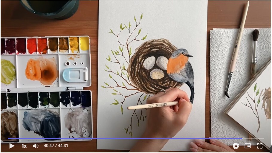 Знакомимся со сложной композицией Выполняем рисунок акварелью - Птица в гнезде.